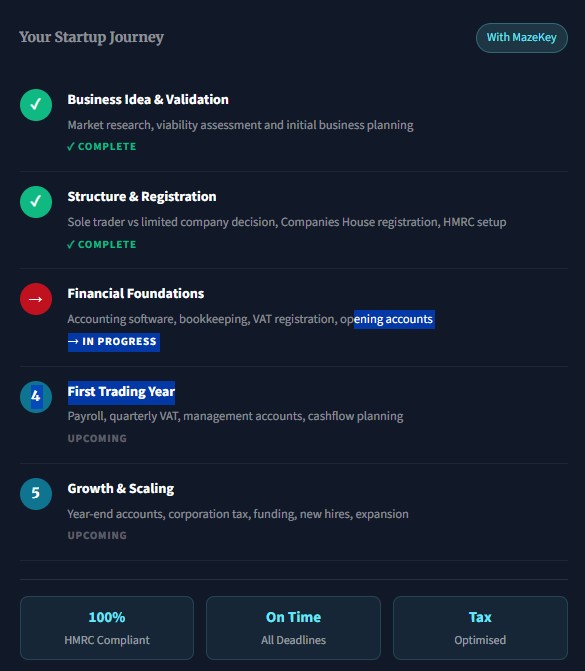 We are accounting specialists for business startups — one of eight specialist sectors we serve at MazeKey. Startups face a completely different set of challenges compared to established businesses: unfamiliar legislation, uncertain cashflow, rapid structure decisions, and the need to build solid financial foundations under pressure.