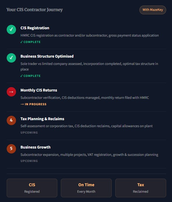 - CIS Specialism: Contractors can save money by registering as Limited Companies. We help CIS contractors structure their business correctly from day one — and recover CIS deductions efficiently so cashflow is never unnecessarily tied up with HMRC.