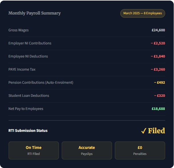 We calculate every payslip accurately — gross pay, income tax (PAYE), National Insurance contributions, pension deductions, student loan repayments and any other statutory deductions — and produce payslips for distribution to your team.
