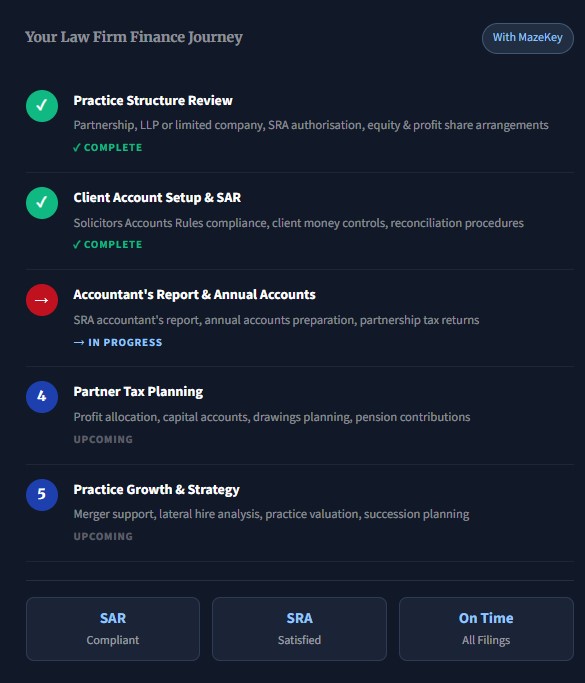 Our specialist law firm clients get full SAR compliance, clean accountant’s reports and optimised partner profit planning — every year, without exception.